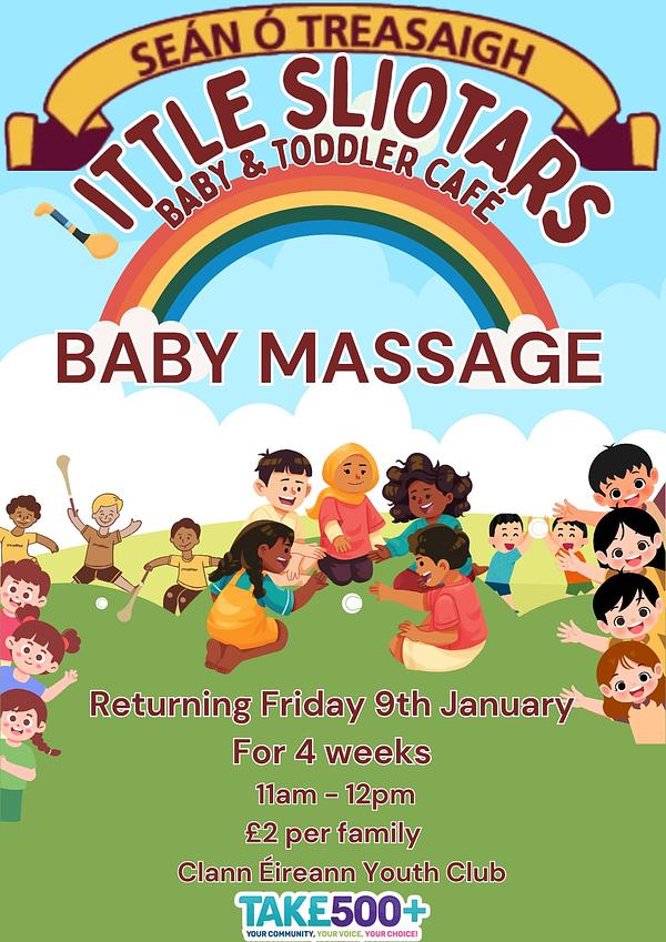 Little Sliotars Baby and Toddler Café is on as normal tomorrow, 11am in Clann Éireann Youth Club. Drop in for a change of pace and a bit of fun! Everyone is welcome. All massage places are booked, but there's room for everyone in the café!