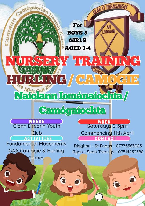 Nursery training continues tomorrow afternoon from 2-3 in Clann Γireann Youth Club. Everyone had a great time last week and we saw a lot of potential talent for the future of our club and for St. Enda's Camogie Club, Derrymacash. All equipment is provided, so if you know anyone who might be interested, spread the word!