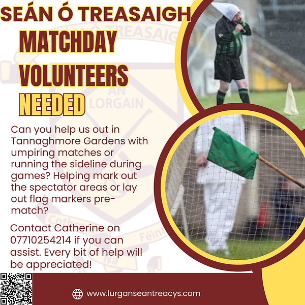 We're putting out a call for anyone who would like to help us out on matchdays at Tannaghmore Gardens. If you can help the referees with umpiring or on the sidelines, or give us a hand to lay out the flag markers and spectator areas, please reach out to Catherine. Any help we can get will be massively appreciated!