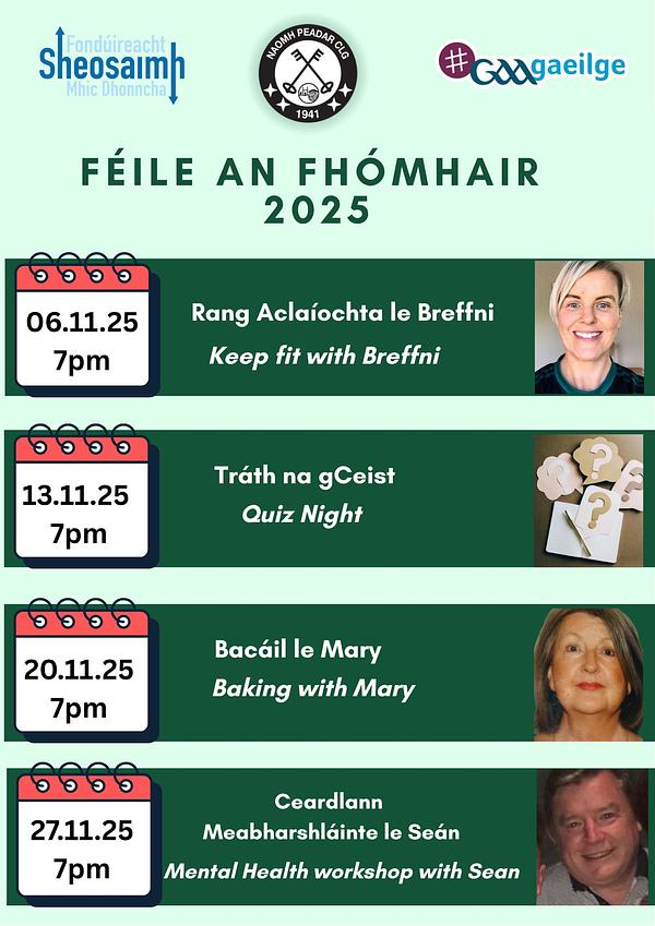 There will be a couple of other events taking place over the next couple of Thursdays when the classes are held as part of St Peter’s Féile an Fhómhair.