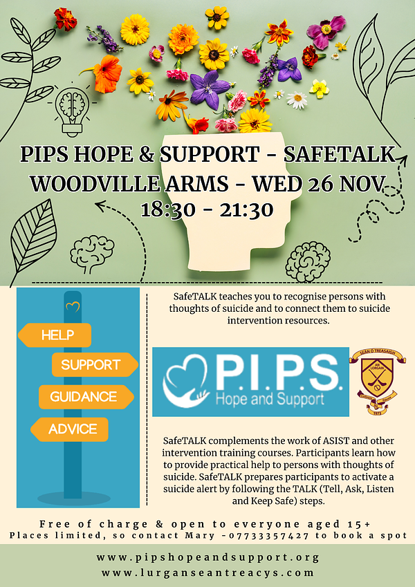 On Wednesday the 26th of November, PIPS will be running a SafeTalk in the Woodville Arms at 18:30. This is aimed at teaching how to spot warning signs in anyone who might be suffering from suicidal thoughts and spreading awareness of the resources available to help. This is a free course, but places are limited, so please contact Mary ASAP to book a spot.
