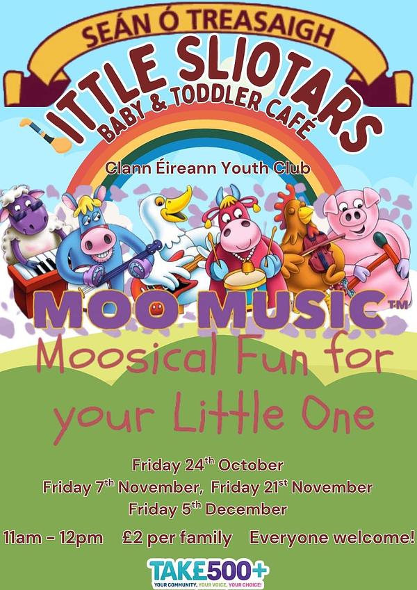 It's another Moo Music week in Little Sliotars Baby and Toddler Café. Call down to Clann Éireann Youth Club tomorrow morning at 11am for some dancing, playtime and maybe a cuppa for the grown-ups. Everyone welcome!