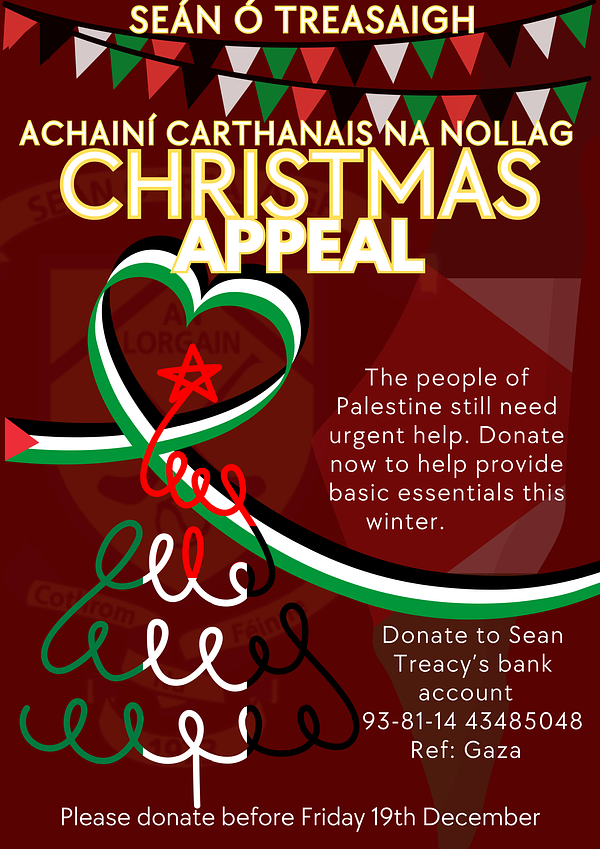 Every year we have a club Christmas charity appeal and this year we have decided to raise funds for the people of Palestine via the Irish Emergency Alliance. As winter sets in help is needed now more than ever. If you can spare anything, please consider donating to help in this humanitarian crisis. Anything at all will help provide basic necessities and life giving aid to families trying to rebuild their lives. Our account details are below, use the reference GAZA. Please donate before the 19th of December.