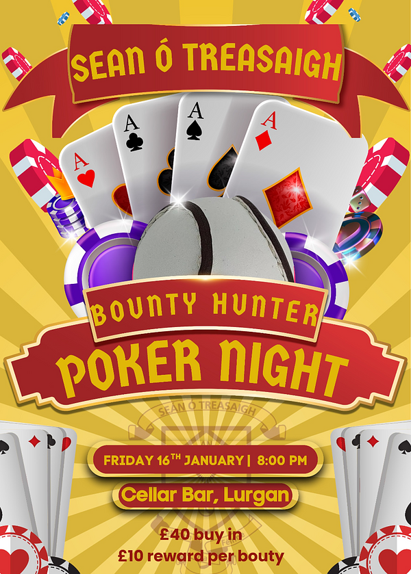 Calling all bounty hunters, our next poker night will be on the 16th of January in the Cellar Bar, Lurgan! The normal rules apply, £40 buy in with a £10 reward for every bounty you collect. Non-members are more than welcome, so if you know anyone who might be interested, spread the word!