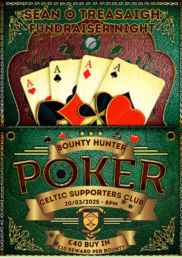 Our next poker night is on Friday the 20th of March, in the Celtic Supporters Club. Normal rules apply, Β£40 buy in, Β£10 reward per bounty. All welcome, so spread the word!