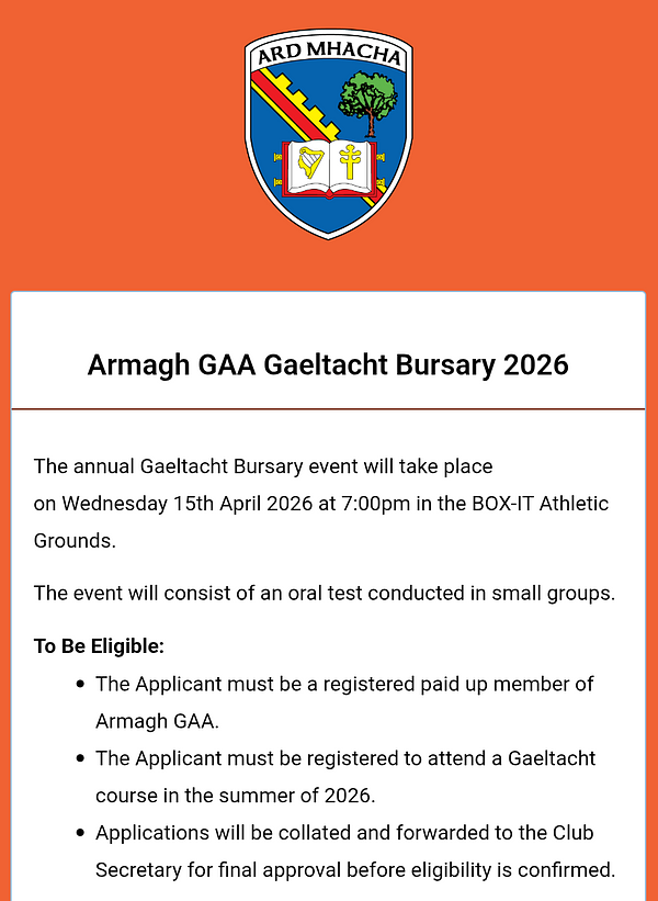 Upon submitting your application, a member of Armagh GAA will verify the applicant’s eligibility, providing all criteria is met, and will email you with the outcome no later than Wednesday 8th April 2026.